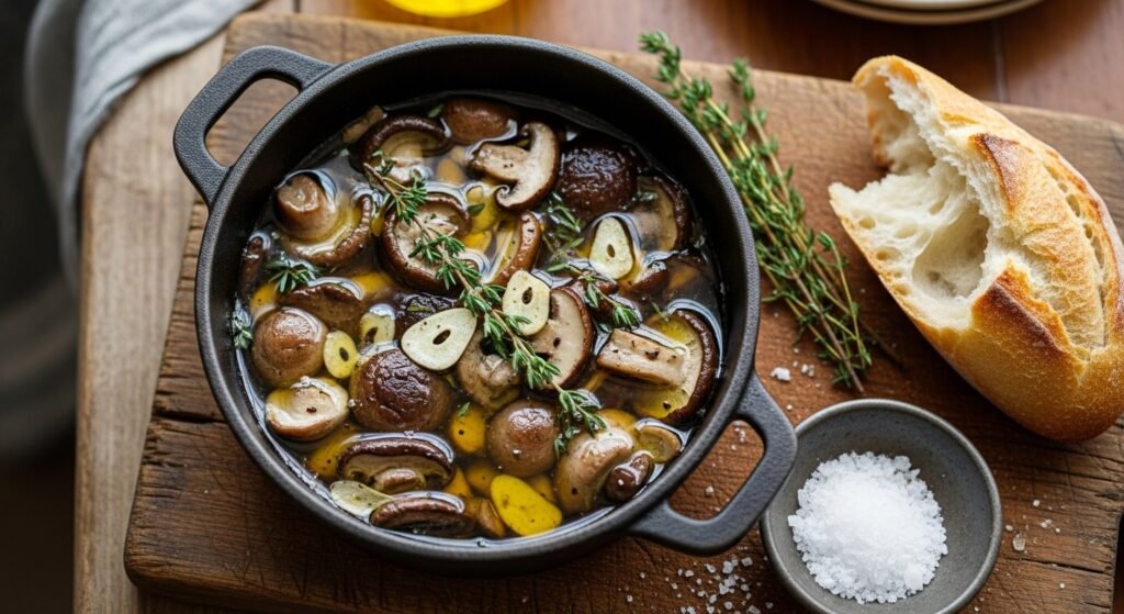 • El Método: Coloca los champiñones limpios (enteros si son pequeños, o en cuartos si son grandes) en una olla pequeña. Cúbrelos completamente con aceite de oliva. Añade aromáticos como dientes de ajo enteros, una hoja de laurel y granos de pimienta.