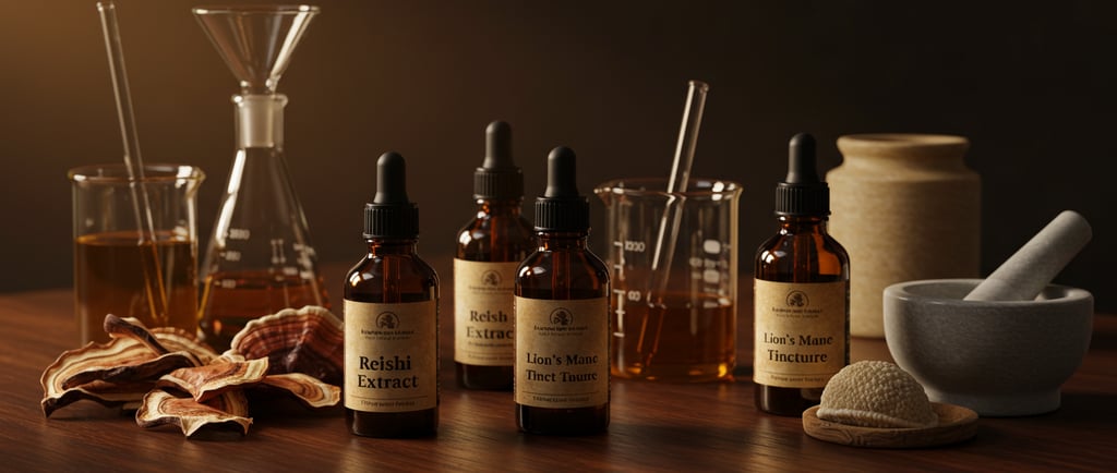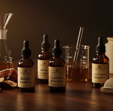 Los extractos y tinturas de hongos son concentrados líquidos que capturan los compuestos naturales de especies como el reishi (Ganoderma lucidum) o la melena de león (Hericium erinaceus).