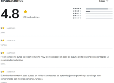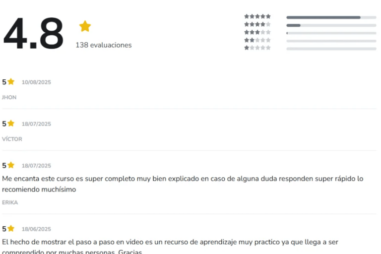 Con una impresionante calificación de 4.8 sobre 5 estrellas basada en más de 138 evaluaciones, la satisfacción de los estudiantes habla por sí sola. Un estudiante, Opamin, comenta: "El hecho de mostrar el paso a paso en video es un recurso de aprendizaje muy práctico ya que llega a ser comprendido por muchas personas. Gracias." Otro añade: "Excelente material, se entiende muy bien."