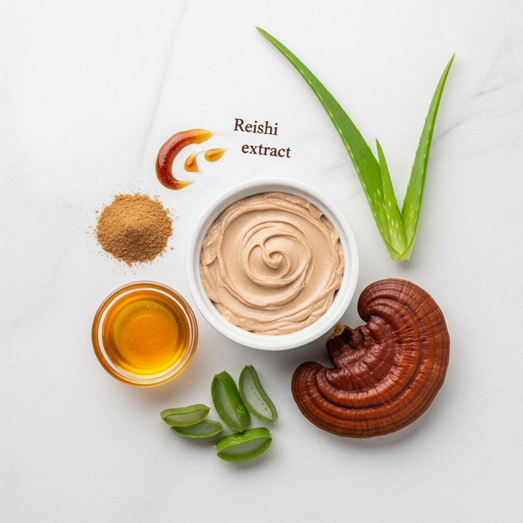 Extracto de Reishi en Polvo (1 cucharadita) : El protagonista. Aportará sus propiedades antioxidantes y anti-inflamatorias para calmar la piel y reducir el enrojecimiento. Asegúrate de usar un extracto de buena calidad