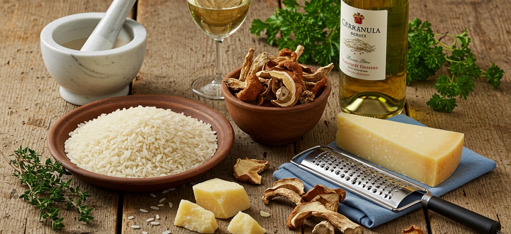 Los Boletus (Porcini): 20g de boletus deshidratados de buena calidad. Son el alma del plato, mucho más intensos que los frescos para este propósito.